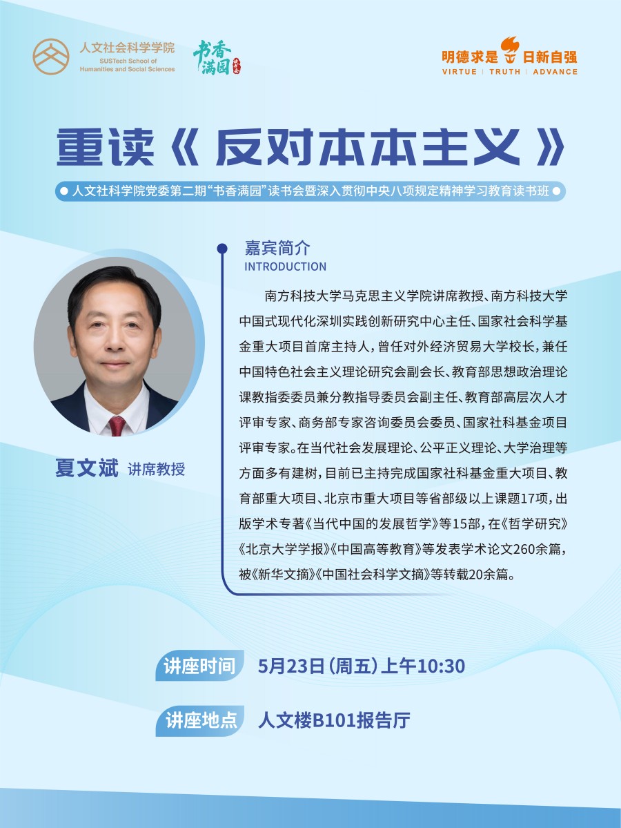 时间:2025-05-23 (星期五) 10:30-11:30 主讲人:夏文斌 讲席教授 授课地点:人文楼B101报告厅